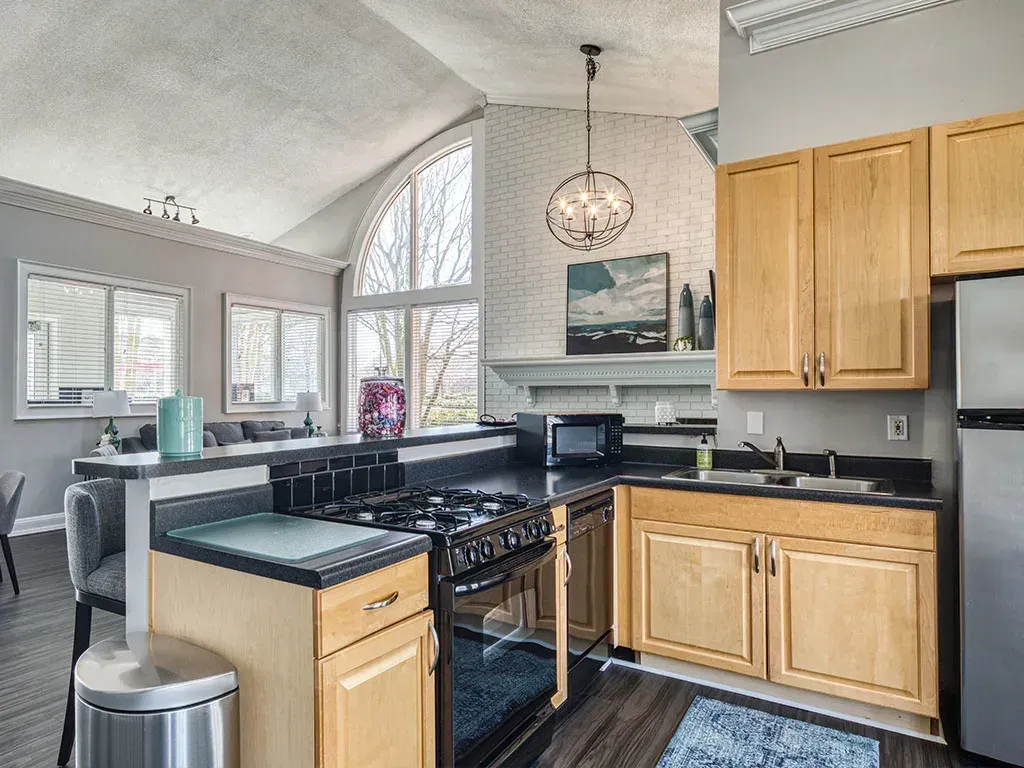 - Fully equipped kitchen includes frost-free refrigerator, gas range, & dishwasher